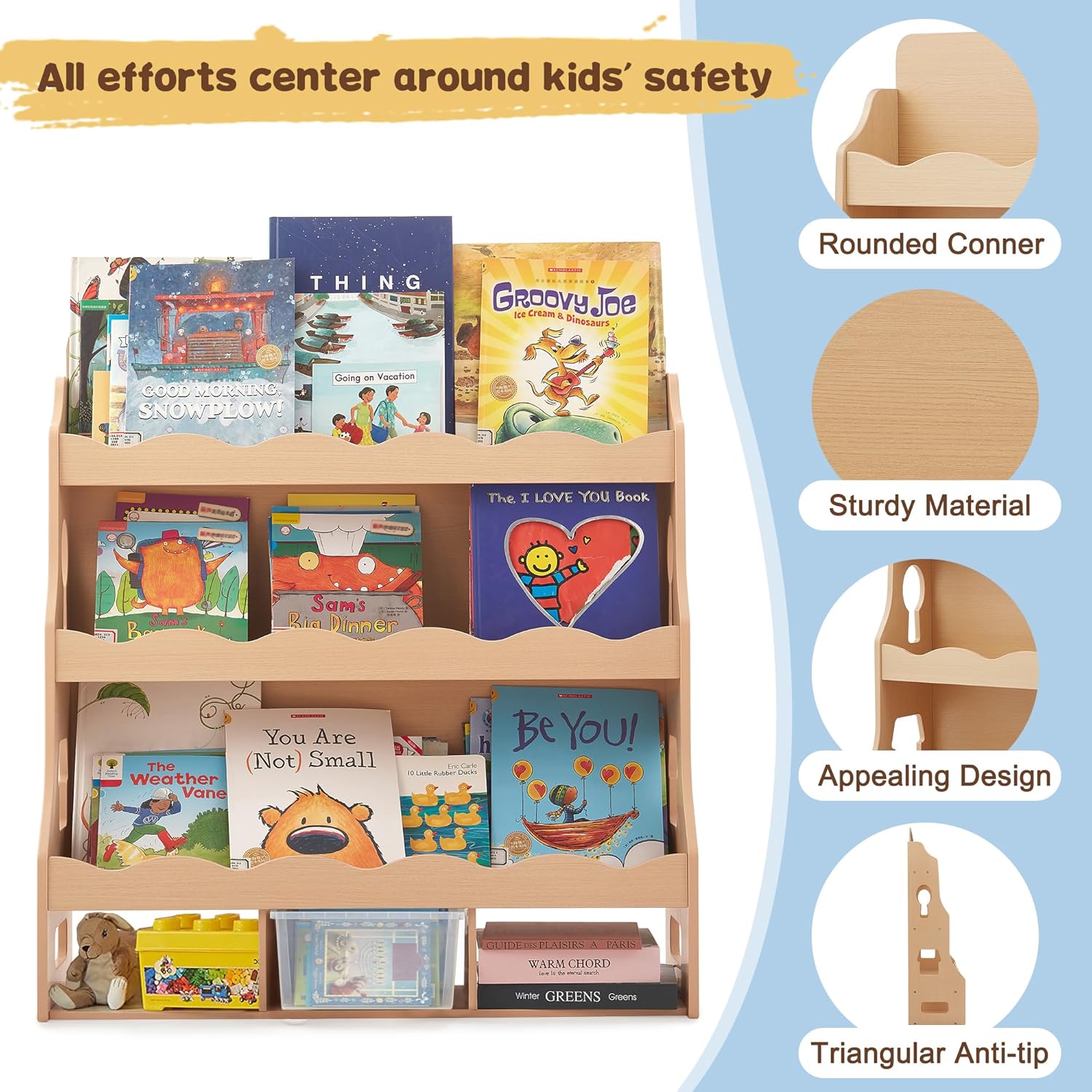 Wooden Kids Bookshelf, Book Shelf for Kids Rooms w/Scalloped Edges, Durable Childrens Bookshelf with 3 Cube Bins for Books & Toys - Toddler Montessori Bookcase Nursery