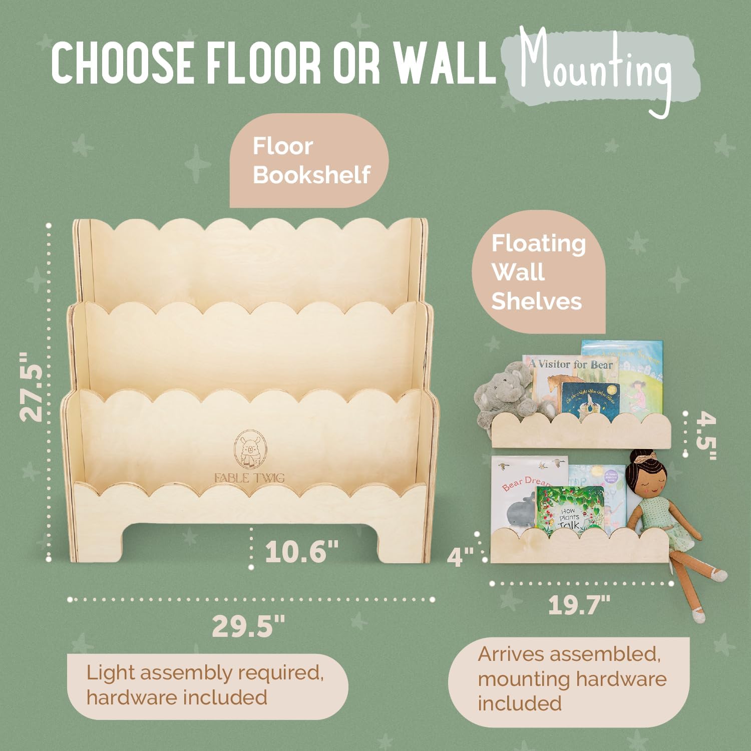 Wooden Kids Bookshelf w/Scalloped Edges- Made in USA- Perfect Height 3-Tier Montessori Shelf- Durable Childrens Bookcase for Kids Room or Playroom- Baby Book Shelf Nursery